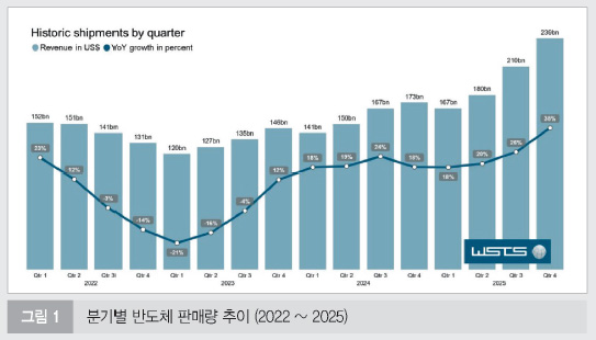이번 보고서에서 가장 눈에 띄는 대목은 분기가 거듭될수록 가팔라진 성장 곡선이다. 특히 `25년 4분기 매출은 전년 동기 대비 38.4% 급증한 2,389억 달러(약 354조7,600억 원)를 기록했다. 이는 엔비디아(NVIDIA), AMD 등 주요 팹리스 기업들의 AI 가속기 공급 확대와 구글, 마이크로소프트 등 빅테크 기업들의 데이터센터 증설 경쟁이 연말에 더욱 치열해졌음을 시사한다. 이러한 급격한 성장은 고성능 로직 칩뿐만 아니라 이를 뒷받침하는 고대역폭 메모리(HBM)의 단가 상승과 출하량 증가가 동시에 맞물린 결과로 풀이된다.
