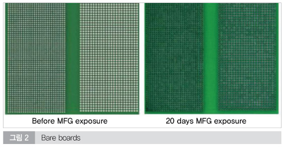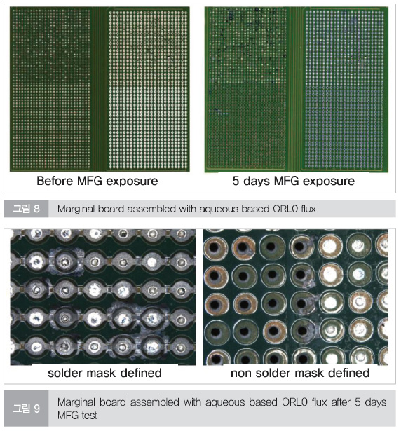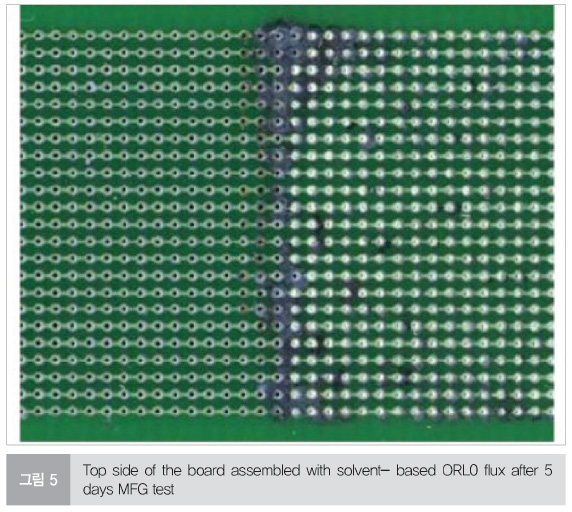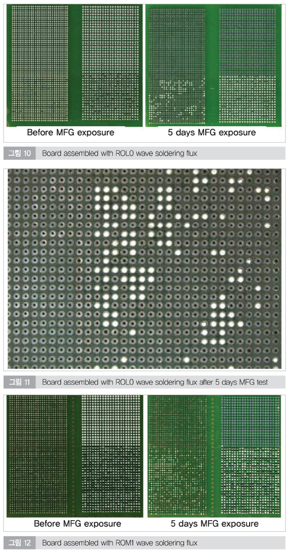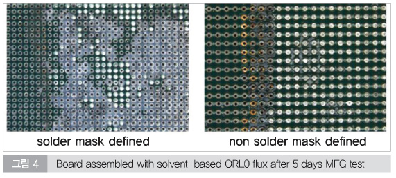 그림 3은 솔벤트 기반 ORL0 플럭스로 어셈블리된 테스트 보드의 결과를 보여주고 있다. 두 이미지 모두 테스트 보드의 바닥면(웨이브 솔더링면)에서 촬영되었으며, 왼쪽 사진은 MFG 노출 전에 찍은 것이고 오른쪽 사진은 MFG 노출 5일 후에 찍은 것이다. 두 그림 모두에서 두 개의 쓰루홀 패턴이 포함되었으며, 두 패턴의 아래쪽 절반은 셀렉티브 웨이브 솔더링되었다. 프로세스 변동으로 인해 왼쪽 패턴은 솔더에 의한 부분적인 젖어듬만 보여주는 반면에, 오른쪽 패턴의 쓰루홀은 솔더로 완전히 덮였다.