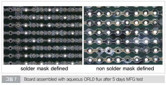 이러한 결론은 바닥면의 솔더링되지 않은 영역(웨이브 솔더링 동안 마스크로 보호됨)이 어떠한 크리프 부식도 나타내지 않았다는 사실에 의해 뒷받침된다. 그림 7은 MFG 테스트 5일 후 샘플의 SMD(solder mask defined)과 NSMD(non-solder mask defined) 쓰루홀의 클로즈업 모습을 보여주고 있다. 두 영역 모두에서 심각한 크리프 부식이 관찰되었다. 다시 말하지만, NSMD 쓰루홀용 오염된 플럭스의 FR-4 표면보다 오염된 플럭스의 솔더 마스크 표면에서 발생하는 크리프 부식이 명확하게 나타났다.