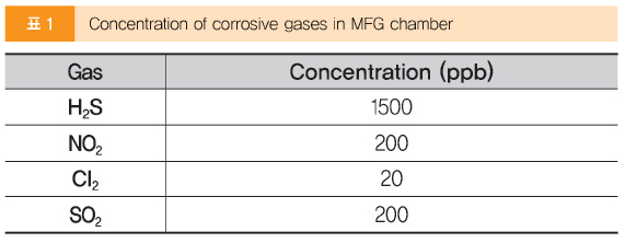 부식성 가스의 농도는 표 1에 요약되어 있다. 온도는 40℃이고 습도는 70~75% RH 사이였다. 챔버의 부식 속도는 Cu 쿠폰 중량 증가 방식을 통해 모니터링했으며, ~500nm/day(동등한 황화구리 두께)로 결정되었다. 유사한 두께의 부식 생성물이 전 세계 일부 현장[15],[16]에 1년 동안 배치된 Cu 쿠폰에서 관찰되었다. 따라서 1년의 설비 현장 배치 데이터는 MFG 챔버에서 1일 노출로 대체하여 시뮬레이션할 수 있다. 비교를 위해 북미 지역의 일반적인 부식률이 실내에서 60~90nm/年, 실외 환경에서 180~270nm/年임을 고려했다.[13]