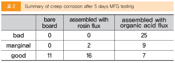 로진계 플럭스로 어셈블리된 18개의 테스트 보드 중 16개에는 약간의 크리프 부식이 나타나지 않았다. 로진계 플럭스로 조립된 18개의 테스트 보드 중 2개만이 국부적인 영역에서 크리프 부식을 보였고 ‘경계’ 샘플로 분류되었다. 이 두 샘플 모두 동일한 플럭스와 솔더 마스크로 조립되었다. 이 두 샘플에서 관찰된 크리프 부식이 특정한 로진계 플럭스의 플럭스 조성 변화 때문인지 플럭스 잔류물 이외의 오염 때문인지는 분명하지 않았다. 이를 통해 로진계 플럭스 잔류물이 크리프 부식을 촉진하지 않는다는 결론을 내리는 것이 타당하다.
