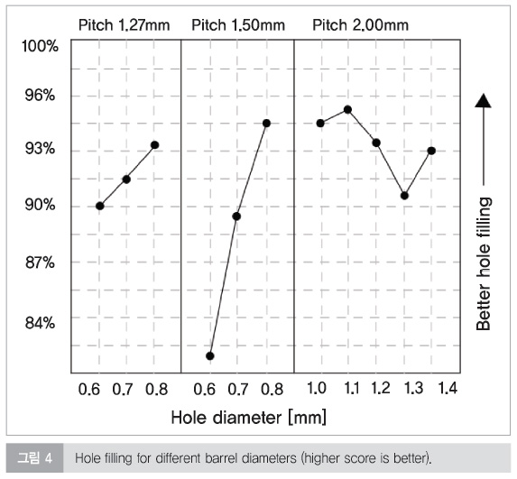 홀 직경도 중요하다. 보드는 서로 다른 피치의 서로 다른 직경을 지니고 있다. 1.27 및 1.50 mm 피치의 경우 0.80mm 직경이 가장 좋은 홀 충진성을 보였다. 2.00mm 피치의 경우, 바람직한 직경은 1.10mm이었다.