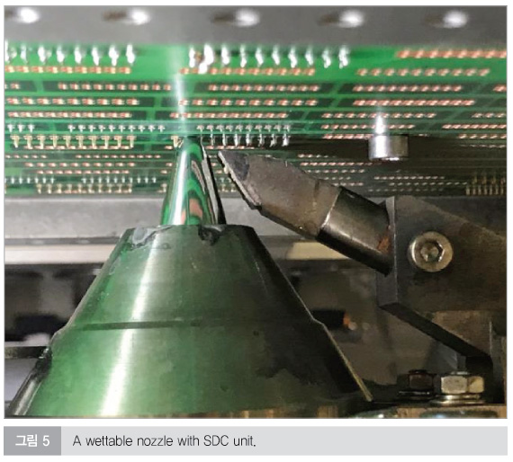 Non-wettable nozzle은 솔더를 한 방향으로 흐르게 한다. 보드와의 접촉은 동일한 드래그 속도에서 더 길었고, 배럴에 가해지는 솔더의 힘에 더 많은 에너지가 존재했다. 따라서 non-wettable nozzle은 더 나은 홀 충전을 보여주었다.