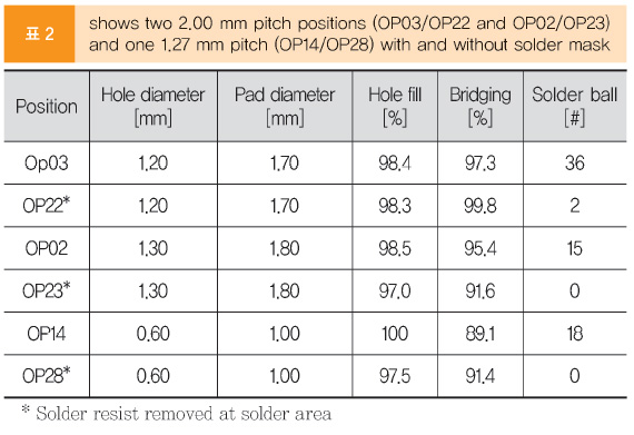 표 2에서는 솔더 마스크가 있고 없고의 차이를 보여주고 있다. 플럭스 A를 이 비교에 사용하였다. 실험에서 1.27mm 피치의 부품은 패드 사이에 솔더 마스크로 18개의 솔더 볼을 가지고 있으며 솔더 마스크를 제거할 때 솔더 볼이 없었다.