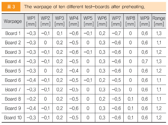 다음 실험에서 10개의 보드를 예열하고 그림 17과 같이 정확한 접촉 센서로 휨을 측정했다. 총 9개의 포인트가 보드 하부를 측정하였다.