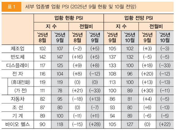 세부 업종별로는 9월 현황에서 반도체를 비롯한 ICT 업종 다수가 기준치를 상회했다. 바이오·헬스와 섬유, 자동차, 기계도 상승 전환하며 일부 업종의 회복세를 보여줬다. 그러나 가전, 조선, 화학, 철강 업종은 전월 대비 하락 전환하며 약세로 돌아섰다.