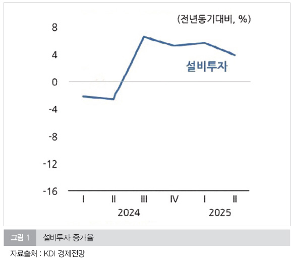 현대경제연구원은 대내외 시장 불확실성으로 투자 여건이 크게 개선되지 않을 것으로 보이나, 디지털 전환 및 그린 전환 등 신산업 투자 수요 등은 확대될 것으로 전망했다. 기업 심리의 침체 국면이 장기화되는 가운데, 자본 조달 비용의 급증, 자본재 가격 상승 등의 영향으로 투자 여력도 취약한 상황이다. 특히, 통상 환경의 악화(관세 전쟁), 해외시장 불확실성(미국 경기 하강, 중국 회복 지연) 등에 따른 글로벌 시장의 수요 침체로 제조업의 생산 설비 확대 동기가 높지 않을 것으로 예상된다. 다만, DT(AI, 데이터센터), GT(신재생에너지 인프라) 등의 신산업 투자 수요 지속될 것으로 보인다. 이에 따라 '25년 설비투자증가율은 '24년의 1.6%보다 낮아진 1.2%를 기록하고, 설비투자증가율은 상반기에 전년동기대비 4.0%를 유지하다가, 하반기에 들어 역(逆) 기저효과가 작용하면서 △1.5%에 그칠 것으로 예상했다.