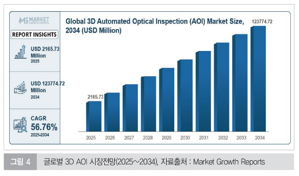 국내 시장이 침체된 것과 달리, 글로벌 3D AOI 시장은 비교적 안정된 성장세를 유지하고 있다. 마켓리서치퓨처(MRFR)는 3D AOI 시장 규모가 `24년 21억6573달러(약 2조9,900억원)에서 `34년에는 무려 1,237억7,472만 달러(약 170조8,000억원)로 급성장할 것이라고 전망했다. 해당 기간동안 연평균 성장률 56.76%를 보일 것으로 예상했다. 성장을 이끄는 주요 요인은 세 가지다. ▶ 전장·자율주행 부품의 미세 납땜 품질 검증 수요 확대, ▶ 반도체 후공정 및 첨단 패키징 검사 자동화 수요 증가, ▶ AI와 빅데이터 기반의 검사 자동화 고도화다.