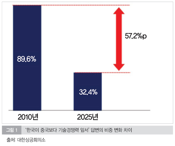 대한상의가 국내 제조기업 370개社를 대상으로 실시한 ‘韓·中 산업경쟁력 인식조사’에서 “중국보다 기술력이 앞선다”고 답한 기업은 32.4%에 그쳤다. 기술 수준이 비슷하다는 응답이 45.4%, ‘중국이 더 앞섰다’는 응답이 22.2%로, 지난 `10년 같은 조사에서 89.6%가 한국 기술력을 우위로 평가했던 것과 대조적이다. 15년 새 약 57%p가 기술격차를 좁히거나 역전당한 셈이다.