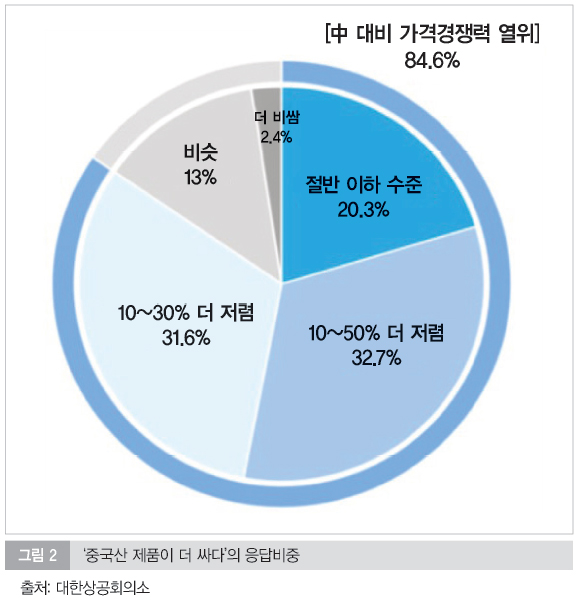 가격경쟁력의 차이는 더욱 뚜렷해졌다. 응답기업의 84.6%가 ‘국산 제품이 중국산보다 비싸다’고 답했으며, 절반 이상(53%)은 ‘중국산이 30% 이상 저렴하다’고 응답했다. 업종별로는 디스플레이(66.7%), 제약·바이오(63.4%), 섬유·의류(61.7%) 순으로 중국산 가격경쟁력이 크게 나타났다. 국제무역센터(ITC) 자료에서도 비슷한 양상이 확인됐다. 중국산 반도체(HS854232)는 한국산의 65% 수준, 배터리(850760)는 73%, 철강 후판(720851)은 87% 수준의 가격으로 수출되고 있다.