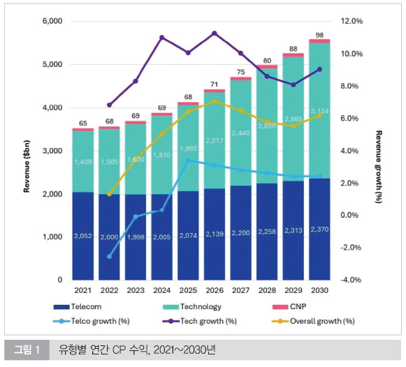 보고서는 기존 통신 서비스 매출은 연평균 2.7% 수준의 완만한 성장에 그치지만, Amazon, Alphabet, Apple, Meta, Microsoft 등 하이퍼스케일 플랫폼 중심 기술 부문은 `30년까지 연평균 9.4% 성장해 전체 CP 매출의 55.9%를 차지할 것으로 내다봤다. 옴디아의 다리오 탈메시오(Dario Talmesio) 리서치 디렉터는 “통신사업자들은 전통적 사용량 기반 과금에서 벗어나 가치 중심 연결(Value-based Connectivity) 모델로 전환하고 있다”며, “6G 도입이 임박하고 AI 인프라 수요가 급증하면서 전략적 투자 방향이 재편되고 있다”고 강조했다.