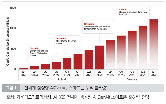 카운터포인트는 전세계 생성형 AI 스마트폰 누적 출하량이 내년 3분기에 10억 대를 넘어설 것이라고 예측했다. 성장 속도 가속화 이유로, 중급형 기기에서도 활용 가능한 고성능 AI 칩셋의 보급과 경량 온디바이스 AI 모델의 빠른 도입을 꼽았다.