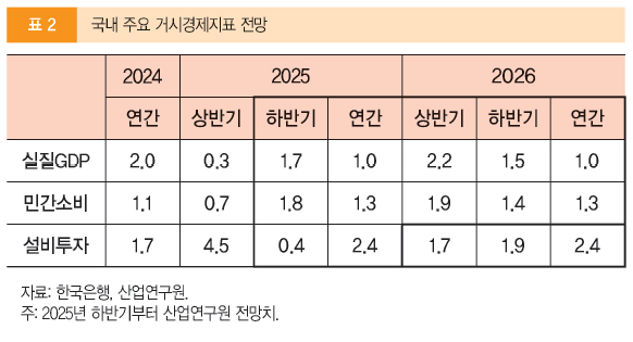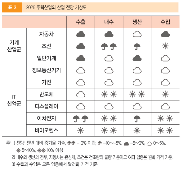 올해 주력 산업 전망은 업종별로 극명하게 갈린다. AI 대전환 수혜를 입는 산업은 도약하겠지만, 관세 장벽과 중국의 추격에 노출된 산업은 혹독한 겨울을 보낼 것으로 보인다. 반도체·정보통신기기·조선·바이오헬스산업은 견고한 성장이 예상되며, 일반기계·가전·디스플레이산업은 완만한 회복 국면에 진입할 것으로 평가된다. 반면, 자동차·섬유는 성장세 정체의 가능성이 제기되었다. 이차전지는 내수는 증가하나 해외 생산 비중이 높아 수출과 국내 생산 위축이 지속될 것으로 보인다.