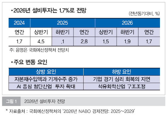 국회예산정책처(NABO)와 산업연구원(KIET), 그리고 주요 금융권 연구소가 내다본 `26년 설비투자 증가율 전망치는 1.7%에서 1.9% 사이다. `24년 하반기부터 반등하기 시작한 설비투자가 `25년을 거쳐 올해에는 안정기에 접어든다는 분석이다.