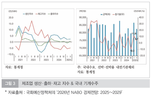 국회예산정책처의 ‘2026년 NABO 경제전망: 2025~2029’ 보고서에 따르면, `25년 들어 제조업의 생산과 출하가 완만한 증가율을 보였고, 재고는 감소세를 나타냈다. 이는 제조업 전반에서 일정 수준 이상의 시장 수요가 뒷받침되고 있음을 시사하며, 향후 설비투자 확대에 긍정적 요인으로 작용할 것으로 풀이된다. 특히 반도체 및 운송장비를 중심으로 한 제조업 내 수요 회복은 `25년 하반기와 `26년 설비투자의 증가세를 견인할 주요 동력으로 꼽힌다. 또한 국내기계수주는 `25년 1분기 두 자릿수 증가율을 기록한 이후 성장세를 유지하고 있다. 이에 대해 보고서에서는 “국내 제조업의 생산능력 확충 수요가 견조함을 보여주는 것으로, 향후 설비투자 확대의 상방 요인으로 작용할 것”이라고 판단했다.