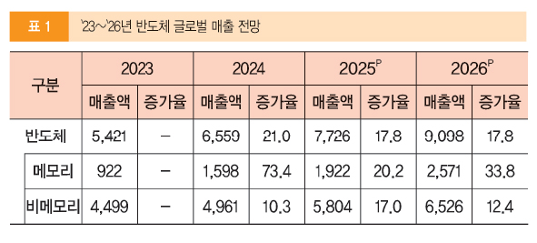 글로벌 반도체 시장이 단순한 업황 회복을 넘어, 인공지능(AI) 인프라 구축에 따른 전례 없는 ‘수요 구조 대전환’의 시대로 진입하고 있다. `25년 대한민국 반도체 수출이 역대 최고치를 경신할 것으로 확실시되는 가운데, `26년에는 메모리 반도체가 시장 성장을 주도하며 사상 최대의 ‘슈퍼사이클’을 맞이할 것이라는 전망이다. IBK기업은행 경제연구소의 자료에서는, "AI 소비 확대가 세계 반도체 시장의 성장을 견인하며, 국내 반도체 생산과 수출은 증가세가 이어질 것"이라고 전망하며, “생성형 AI 모형, AI 최적화 인프라, AI 인프라 소프트웨어, AI 처리 반도체 등의 글로벌 소비가 확대되며 세계 매출을 주도할 것”이라고 예상했다.