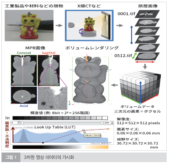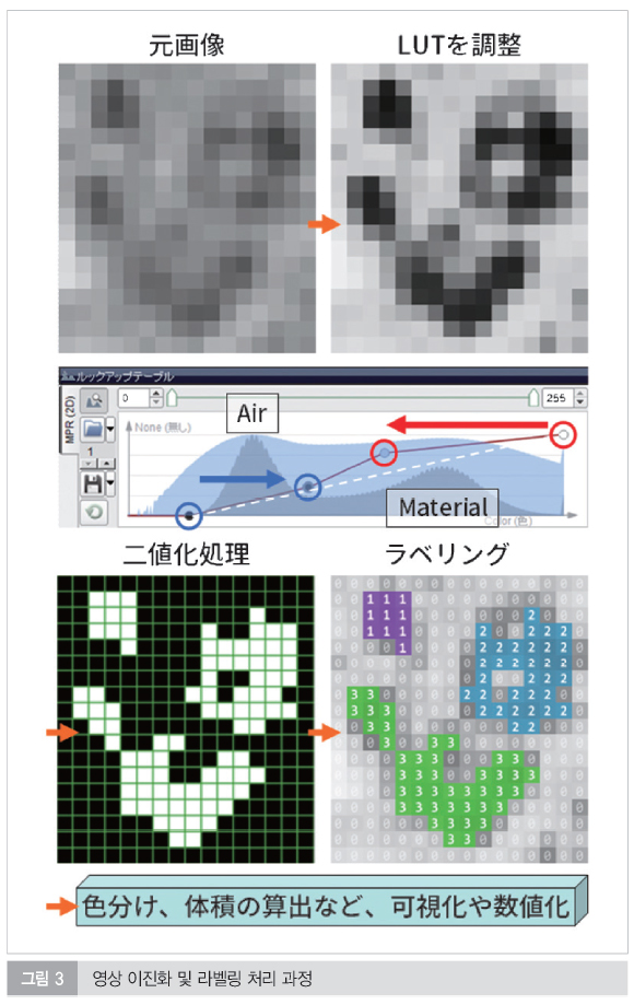 X선 CT나 FIB(Focused Ion Beam)-SEM과 같은 이미징 장비에서는 보통 연속된 단면 이미지들이 순서대로 얻어진다. 이렇게 수집된 디지털 3차원 영상 데이터는 분석 대상과 목적에 맞게 적절한 소프트웨어를 사용하여 시각화하고, 크기나 형태를 측정하며, 구조를 분석·평가하고 정량적으로 해석하는 과정이 필요하다.