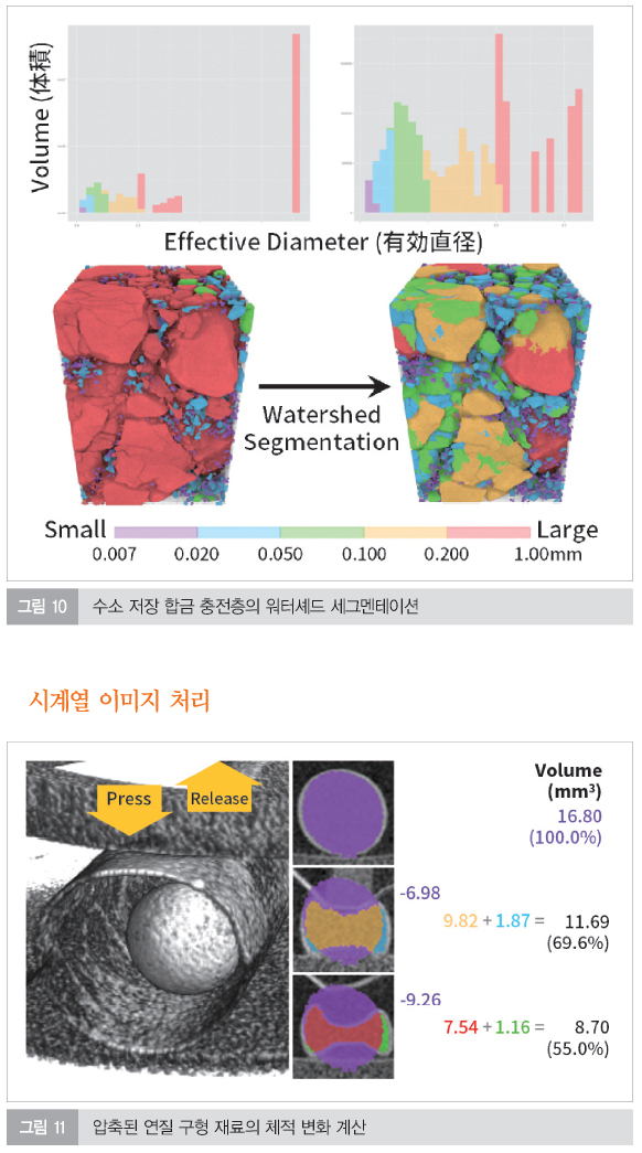 그림 10은 수소 저장 합금 충전층(packed bed)에 워터셰드(Watershed) 세그멘테이션을 적용한 예를 보여준다. 오쿠무라 등은 수소 저장 합금 충전층을 X선 CT로 촬영하고, 수소 흡장과 분쇄가 진행되는 과정에 따라 단계적으로 CT 영상을 취득하여 이미지 분석을 수행하였다[7]. 이 과정에서 워터셰드 기법을 이용해 서로 접촉한 입자 집합을 분리함으로써, 개별 입자를 인식하고 정량 평가를 수행할 수 있었다.