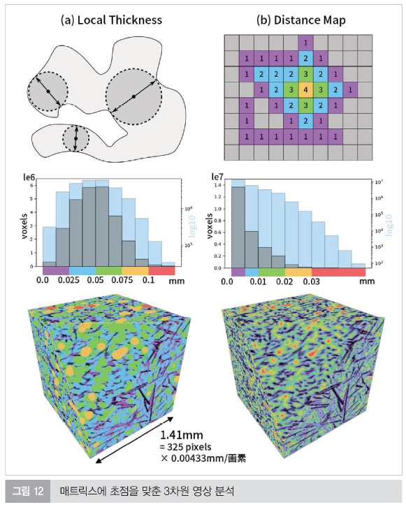 이와 같은 연산은 불규칙한 형상이나 복잡한 연결 구조에도 적용할 수 있으며, 각 복셀에 대해 하나의 스칼라 값을 부여한다. 그 결과, 색상 코드로 가시화한 영상의 생성이나 히스토그램 작성, 그리고 계산된 값을 물리 단위로 변환하는 작업을 비교적 쉽게 수행할 수 있다. 이 예에서 볼 수 있듯이, 겉보기에는 특성 평가가 어려워 보이는 복잡한 연결 구조라도, 일정한 처리 규칙에 따라 얻어진 정보를 비교하고 평가함으로써 시편 간의 차이와 그 크기, 나아가 두께, 표면, 깊이, 복잡도와 같은 구조적 특성을 정량적으로 파악할 수 있다. 이러한 분석을 수행하기 위해서는 소프트웨어 내부에서 이루어지는 처리 과정과, 그 결과로 얻어지는 수치의 의미를 이해한 뒤, 이를 통계적인 관점에서 해석하는 것이 중요하다.