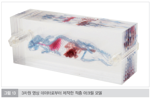 마지막으로, 3차원 이미지 데이터로부터 제작한 적층 아크릴 모델(Layered Acrylic Model)을 소개한다. 이 모델은 연속적인 단층 영상을 가능한 한 적은 슬라이스 수로 축약하면서도 3차원적 특징을 유지하도록 하는 기법을 바탕으로 한다. 이렇게 선택된 슬라이스들을 투명 패널에 인쇄하여 순차적으로 적층함으로써, 3차원 영상을 물리적인 적층 아크릴 모델로 변환하였다[8].