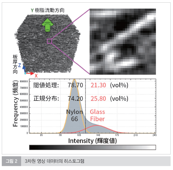 그림 2의 예에서는 히스토그램을 정규 분포로 피팅한 뒤, 수지(resin)와 유리섬유(glass fiber)라는 두 구성 성분의 분포가 서로 교차하는 강도값을 임계값으로 설정하였다. 이를 통해 계산한 체적 분율과, 피팅된 정규 분포로부터 직접 계산한 체적 분율을 서로 비교하였다. 실제 응용에서는 이러한 임계값을 각 구성 성분의 혼합 상태와 상대적인 비율을 고려하여 설정한다. 그러나 구조가 복잡해질수록 각 성분의 강도 분포는 서로 가까워지고 겹치게 되며, 이 경우 단순한 임계값 설정만으로는 성분을 명확히 분리하기가 어려워진다.