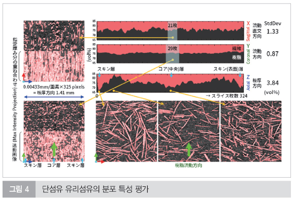 그림 4는 그림 2의 3차원 이미지를 단순 이진화한 후 수행한 이미지 분석 결과를 나타낸다. 우리는 X선 CT를 이용하여 사출 성형 수지 제품 내부에 포함된 직경 10μm 유리섬유를 가시화하고 분석하는 방법을 정립하였으며, 표피층(skin layer)과 코어층(core layer)에서의 섬유 배향에 대한 기존의 이해를 검증하였다[3]. 이 과정에서는 얇은 판상 성형품에서 절취한 시편을 X선 CT로 촬영한 뒤, 등방성 볼륨 데이터를 추출하고, X / Y / Z 방향에 대해 섬유의 공간 밀도와 변동을 동일한 조건에서 비교하였다. 그 결과, 적절한 평가 지표를 정의함으로써 해당 재료의 이방성에 대해 의미 있는 분석 결과를 도출할 수 있었다.