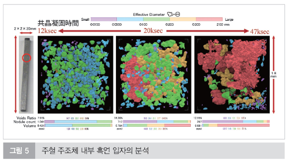 그림 5는 주철 주조체 시편을 X선 CT로 촬영한 뒤, 내부에 분포한 흑연 입자를 3차원으로 가시화한 예를 보여준다. 이 분석을 통해 응고 시간이 길어질수록 흑연 입자들이 서로 응집하여, 체적과 표면적이 더 크고 구조가 복잡한 청키 그래파이트(chunky graphite)를 형성한다는 점을 명확히 확인하였다[4].