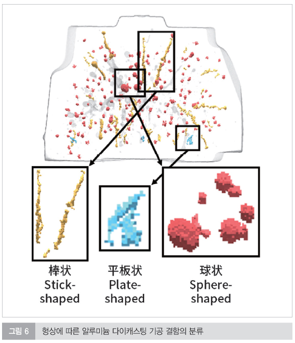 그림 6은 알루미늄 다이캐스팅 내부에 존재하는 기공 결함을 형상에 따라 분류하고, 이를 3차원으로 가시화한 예를 보여준다. 우리는 불규칙한 형상을 갖는 공극과 입자를 비교적 계산 비용이 낮은 형상 인자(shape factor)에 기반하여 분류하는 강인한 계산 방법을 제안하였다[5]. 방사상으로 길게 늘어난 기공이 분포한 구조는 성형 과정에서의 용탕 유동이 반영된 결과로 해석할 수 있다.