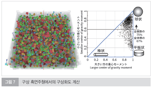 그림 7은 각 흑연 입자에 대해 서로 직교하는 세 방향의 중심 2차 모멘트(centroidal moments)의 비를 계산하고, 이를 산점도로 나타낸 예를 보여준다. 이 중심 모멘트는 불규칙한 입자 형상에 대해 계산되는 값으로, 입자의 형상 분포로부터 얻어지는 고유벡터에 의해 정의되는 세 직교 축의 길이와 밀접한 상관관계를 갖는 물리량이다.