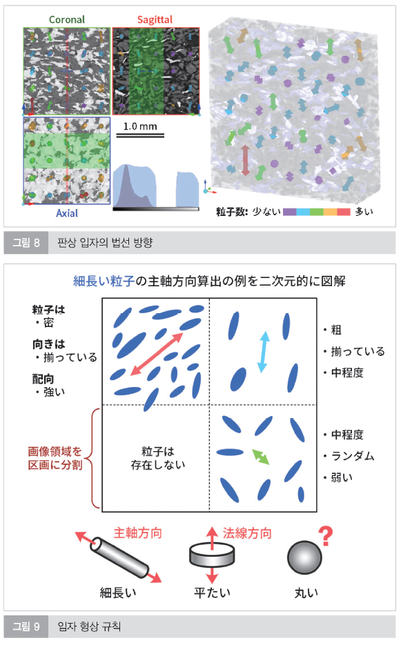 배향 계산은 그림 9에 나타낸 바와 같이, 길게 늘어난 입자뿐만 아니라 평판형 입자에도 적용할 수 있다. 각 화살표의 길이는 해당 위치에서의 선호 배향의 정도를 나타내며, 화살표의 색상은 입자의 국소 수밀도(local number density)를 나타낸다.