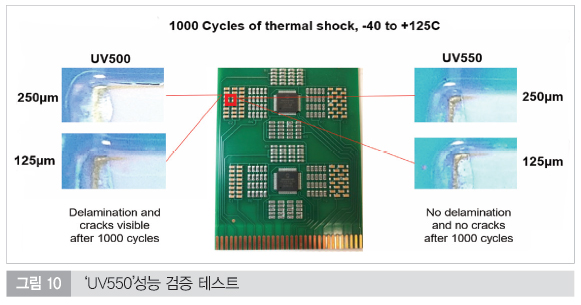 낮은 탄성 계수(Low Modulus)를 가지고 있어, -65°C ~ 150°C의 급격한 온도 변화에도 코팅막이 깨지거나 부품에 기계적 스트레스를 주지 않는다. 자동차 전장 부품에 최적화되어 있다.