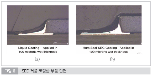 휴미실 기술팀은 SEC 기술의 우수성을 입증하기 위해 실제 부품 리드의 단면을 현미경으로 정밀 분석하였다. 그림 6에서는 SEC 제품으로 코팅한 부품의 단면을 보여주고 있다.