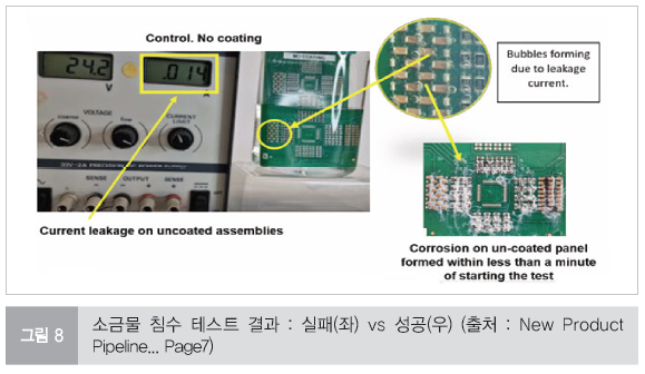 가장 가혹한 환경을 시뮬레이션하기 위해, 전원(24V DC)이 인가된 작동 중인 PCB를 전도성 소금물 용액에 완전히 침수시키는 실험을 진행하였다. 그림 8에서는 소금물 침수 테스트 결과를 나타내고 있다.