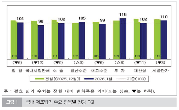 올해 1월 제조업 업황 전망 PSI는 104로 확장 국면을 이어갈 것으로 예상됐지만, 내수 전망(96)이 7개월 만에 기준치를 하회한 점이 부담 요인으로 부각됐다. 반면 수출(102)과 생산 수준(105)은 기준치를 웃돌며 제조업 전반의 하방 리스크를 일부 완충하는 역할을 할 것으로 보인다.