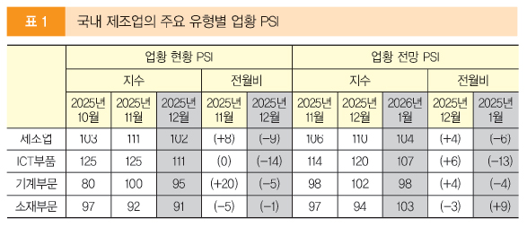 유형별로 보면 12월 현황에서는 ICT 부문이 111로 8개월 연속 기준치를 상회했지만, 전월 대비 14포인트 급락하며 피로감이 감지됐다. 기계(95)와 소재(91) 부문은 모두 기준치를 하회했으며, 특히 소재 부문은 8개월 만의 최저치를 기록했다.