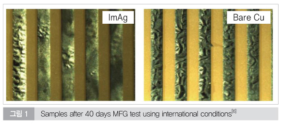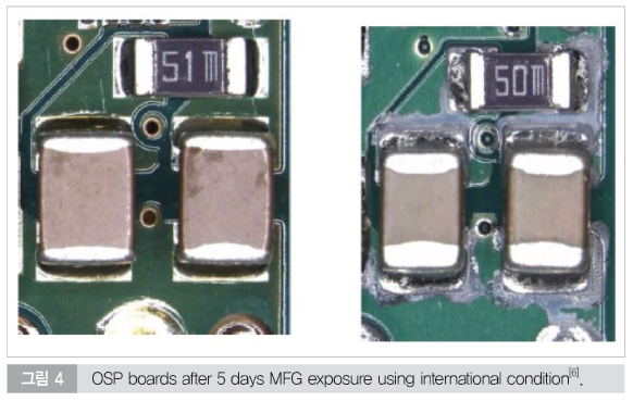 그림 4에서는 국제 조건 하에서[6] MFG 노출 후 5일이 흐른 2개 PWB를 비교하여 보여주고 있다.