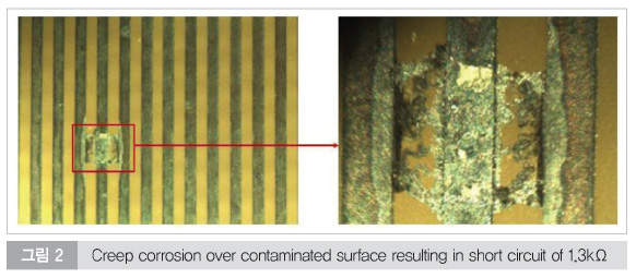 그림 2에서는 MFG 노출 2일 후의 ImAg 도금처리된 IPC-B25 comb 쿠폰을 보여주고 있다. 대부분 영역에서 크리프 부식이 관찰되지 않았지만 ImAg 도금 트레이스에서 심각한 국부적인 부식이 관찰되었다. 흥미롭게도 쿠폰 중간에 물방울 모양의 영역 내에서 크리프 부식이 관찰되었으며 1.3kΩ의 쇼트가 측정되었다. 이 결과는 크리프 부식이 높은 표면 특성이고, 표면 화학적 특성에 민감하다는 것을 나타낸다. 깨끗한 FR-4 표면은 크리프 부식을 지원하지 않는 반면, 오염된 FR-4 표면은 크리프 부식을 지원한다. 외관상으로는, 부식 생성물이 이러한 표면에 서서히 나타나기 위해서는 특정 표면 특성이 필요하다.