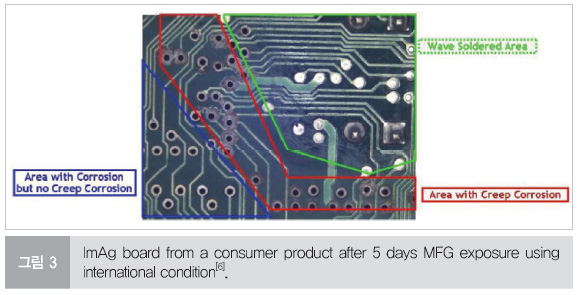 그림 3은 국제 조건 하에서의 MFG 노출 5일 후의 결과를 보여주고 있다. 뚜렷하게 다른 세 영역이 관찰되었다. (1) 오른쪽 상단 모서리 영역, via가 셀렉티브 솔더링되었는데, 솔더에 의해 완전히 덮여졌다. 이 영역에서는 부식이 관찰되지 않았다. (2) 왼쪽 하단 모서리 영역, 납땜되지 않았고 via에 Ag 마감재가 완전하게 노출되었다. 이 영역에서 심각한 부식이 관찰됐지만, 크리프 부식은 보이지 않았다. (3) 솔더링되지 않은 영역과 웨이브 솔더링된 영역 사이의 경계 영역, 이 경계 영역에서 심한 크리프 부식이 나타났으며 크리프 부식으로 인한 쇼트도 관찰되었다. 솔더링된 부분의 부식 없음, 경계 부분의 크리프 부식, 솔더링되지 않은 부분의 크리프 없는 부식 패턴이 회로 기판 전체에 걸쳐 반복적으로 관찰되었다.