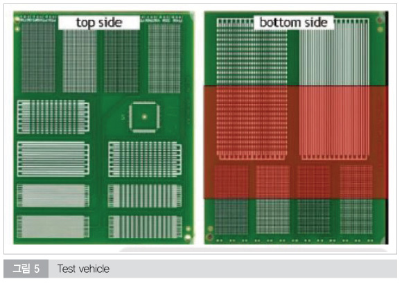 4개의 빗살(comb) 패턴의 쓰루홀이 있는데, 각 측면에 2개의 SMD(solder mask defined) via와 2개의 NSMD(non-solder mask defined) via가 적용되었다. QFP 부품용 패턴도 상단에 포함되어 있다. 바닥면의 중간 영역은 셀렉티브 웨이브 솔더링을 위해 표시되었다(그림 5의 오른쪽 이미지 참조).