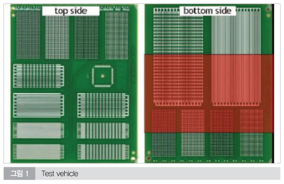 4개의 빗살(comb) 패턴의 쓰루홀이 있는데, 각 측면에 2개의 SMD(solder mask defined) via와 2개의 NSMD(non-solder mask defined) via가 적용되었다. QFP 부품용 패턴도 상단에 포함되어 있다. 바닥면의 중간 영역은 셀렉티브 웨이브 솔더링을 위해 표시되었다(그림 1의 오른쪽 이미지 참조).