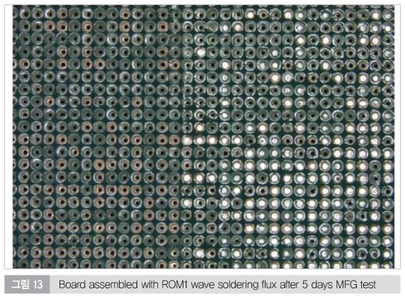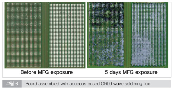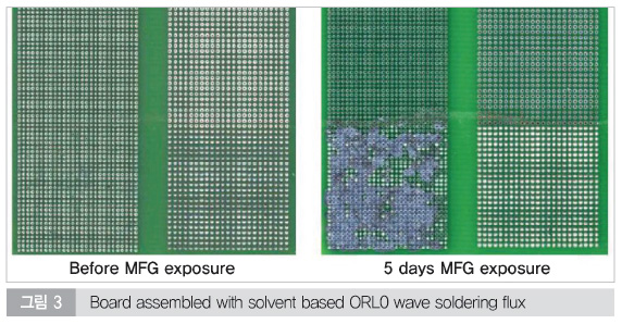 그림 3은 솔벤트 기반 ORL0 플럭스로 어셈블리된 테스트 보드의 결과를 보여주고 있다. 두 이미지 모두 테스트 보드의 바닥면(웨이브 솔더링면)에서 촬영되었으며, 왼쪽 사진은 MFG 노출 전에 찍은 것이고 오른쪽 사진은 MFG 노출 5일 후에 찍은 것이다. 두 그림 모두에서 두 개의 쓰루홀 패턴이 포함되었으며, 두 패턴의 아래쪽 절반은 셀렉티브 웨이브 솔더링되었다. 프로세스 변동으로 인해 왼쪽 패턴은 솔더에 의한 부분적인 젖어듬만 보여주는 반면에, 오른쪽 패턴의 쓰루홀은 솔더로 완전히 덮였다.