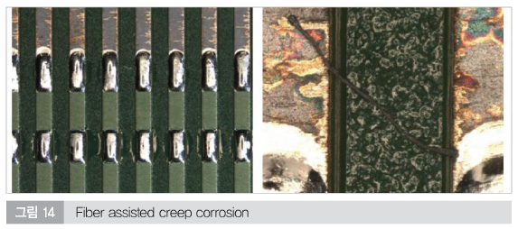 그림 14은 MFG 테스트 5일 후 ROL1 플럭스를 포함하는 솔더 페이스트로 조립된 샘플을 보여주고 있다. 왼쪽 이미지는 노출된 ImAg 도금 트레이스의 심각한 국부 부식을 보여주고, 오른쪽 이미지는 인접한 트레이스를 가로지르는 광섬유이다. 광섬유는 황화구리로 덮여 있으며 인접한 트레이스 사이에서 132kΩ의 단락을 발생시킨다. 크리프 부식이 표면에 매우 민감하다는 것을 다시 한번 입증하였다. 섬유 표면이 크리프 부식을 지원하기 위해 활성화되는 동안 깨끗한 솔더 마스크나 로진계 플럭스 잔여물은 ‘크리프 생성 가능한’ 표면을 제공하지 않는다.