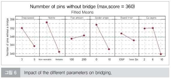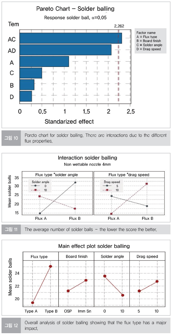 통계적으로 중요한 파라미터는 플럭스와 솔더 각도 간의 상호작용이다. 플럭스 A는 모든 조건에서 더 일관적인 모습을 보였다. 반면, 플럭스 B는 고속에서 수평적인 솔더링을 보이지 않았다. 일정 각도에서 솔더링할 때 SDC에서 나오는 질소는 납땜 직전에 보드 표면을 더 가열할 수 있다. 포트에서 솔더의 드레인이 부드러워지고, 줄어들면서 솔더 볼링이 된다. 솔더 마스크의 점착성은 SDC의 고온 가스에 의해 영향을 받을 수 있는 중요한 요소이다.