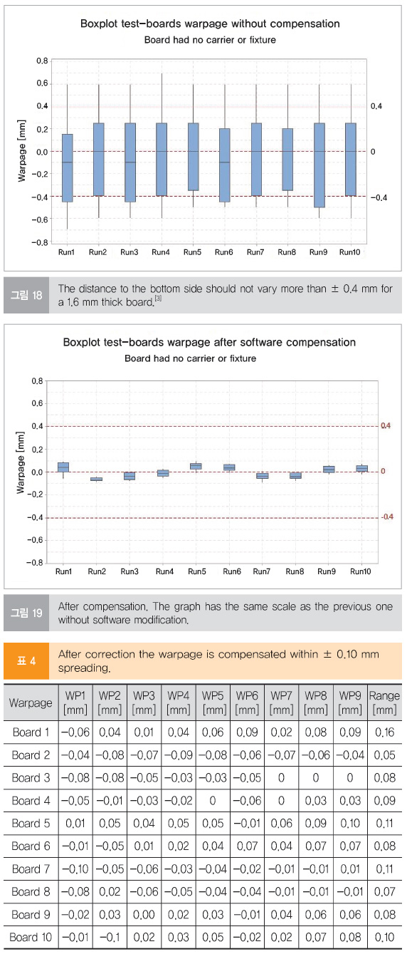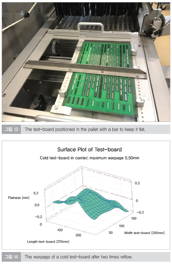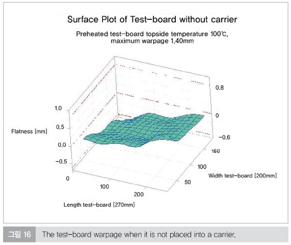 테스트 보드 솔더링 전에 캐리어에 놓았고, 휨은 정밀한 레이저 센서를 이용하여 측정하였다.