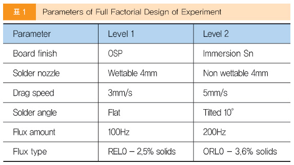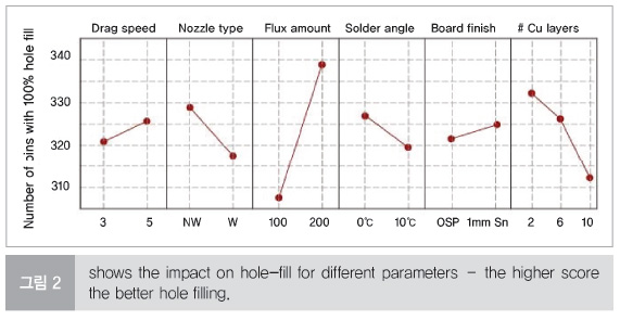 첫 번째 실험에서는 홀 충진에 중점을 두었다. 솔더성에 영향을 끼치는 전통적으로 입증된 서로 다른 5가지 파라미터를 사용한 완전요인배치 설계(factorial design of experiment)를 선택했다. 이들 요인에는 플럭스 및 솔더링 파라미터가 포함된다. 플럭스 양과 타입은 두 가지 레벨에서 선택했다. 솔더 드래그 속도(접촉 시간), 노즐 유형 및 솔더 각도는 다른 요인이다. 솔더 온도가 홀 충진에 영향을 미치는 또 하나의 요인이기는 하지만, 300℃로 일정하게 유지하였다. 예열 설정도 일정하게 유지하였다.