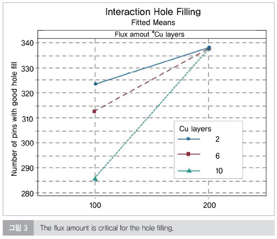 큰 영향을 미치는 두 가지 요소는 플럭스 양과 Cu-레이어의 수이다. 솔더가 구리 배럴로 흐르도록 지원할 수 있는 플럭스가 충분해야 한다. Cu-레이어의 열량이 너무 많은 열을 흡수하여 솔더가 보드의 상단에 닿기 전에 굳어졌다. 결론적으로, 열량이 높을수록 더 많은 플럭스 활성도가 필요하다. 플럭스 양과 Cu-레이어 간의 상호작용이 발견되었다. 그림 3에서는 충분한 플럭스 활성화로 모든 배럴의 홀 충진이 양호함을 보여준다. 심지어 10층의 Cu-레이어가 있는 홀에서도 양호했다.