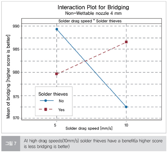 Non-wettable nozzle을 이용하여 브릿징이 적다는 데이터를 보여주고 있다. 3mm/s의 드래그 속도에서 더 좋은 결과가 나왔다. 홀 충진에 적합한 컨베이어의 기울기는 브릿징에 부정적인 영향을 미쳤다. 이는 평면 솔더링에 최적화된 SDC 각도를 변경함으로써 개선될 수 있다.