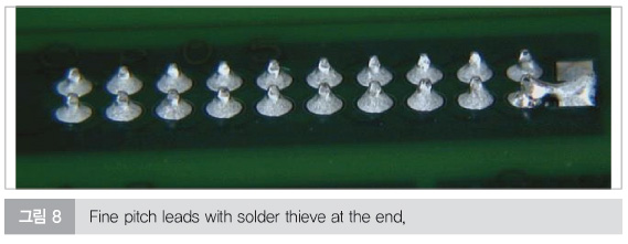 솔더 치프는 패드에 솔더를 잡는다. 그림 8과 같이 솔더가 핀과 솔더 치프 사이에서 브릿징이 되지 않아 재작업을 피할 수 있다. 솔더 치프는 보드에서 더 많은 공간을 소비한다. 소형화로 솔더 치프를 추가하는 것이 중요할 수 있다. 10mm/s의 드래그 속도는 예외적이다. 실험에서는 올바른 파라미터 설정을 통해 어셈블리에서 반드시 솔더 치프가 필요하지 않다는 것을 증명하였다.
