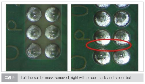 2.00mm 피치 부품의 경우, 유사한 차이를 보였다. 솔더 마스크를 제거할 때, 솔더 볼 수가 96% 감소했다. 회로 보드 상의 솔더 볼은 PCB의 솔더 표면의 플럭스 가스와 드레인의 결과이다.