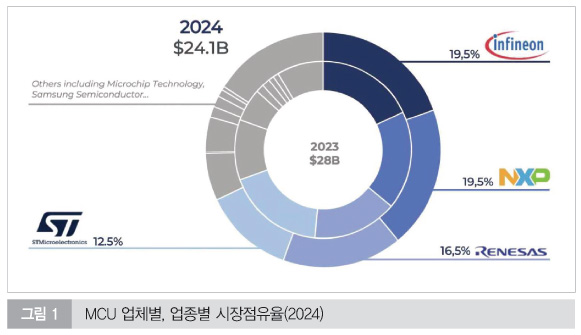 자동차 산업은 MCU 매출의 핵심 원동력으로 `30년까지 130억 달러(약 18조8,500억 원)에 달할 것으로 예상되며, 도메인·존 제어, 첨단 운전자 지원 시스템(ADAS) 인텔리전스, 네트워크 보안, 차량 전기화 전환이 성장의 주요 요인으로 작용하고 있다. 스마트카드 및 보안 MCU 시장은 `30년까지 13.5%의 CAGR을 기록하며 가장 빠른 성장세를 보일 것으로 전망된다. 산업 및 방위용 MCU는 약 9% CAGR로 안정적인 성장세를 이어갈 것으로 예상되며, 전체 MCU 시장 내 주요 기업인 Infineon Technologies, NXP, Renesas, STMicroelectronics는 `24년 약 70%의 점유율을 차지할 것으로 보인다.